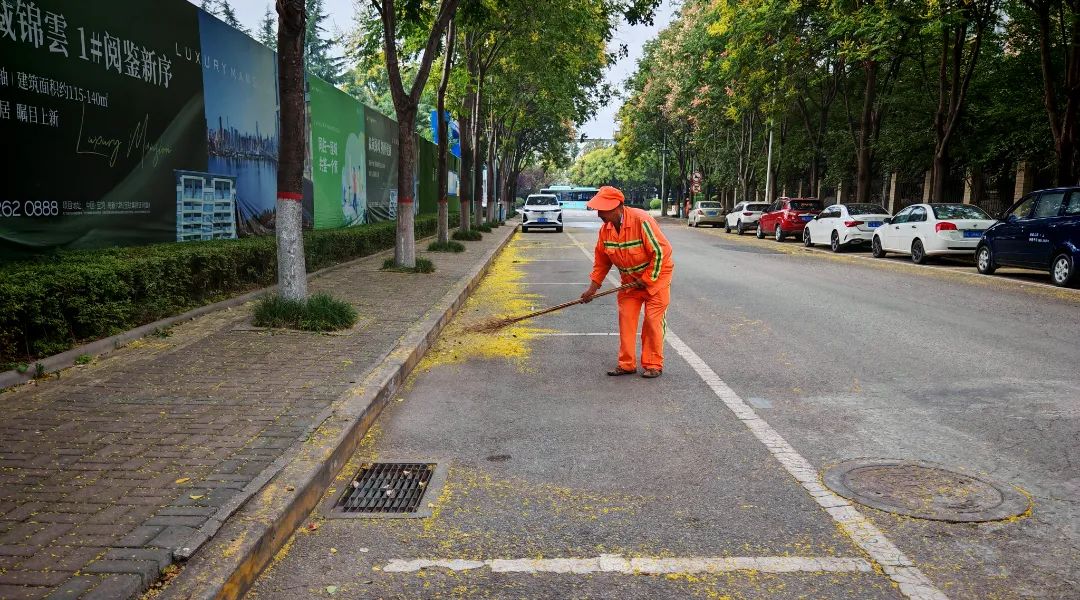 在日常保洁作业的基础上,公司环卫部门紧密结合精细化管理标准,科学调度环卫人员。每日对落花路段实施全方位清扫收集,确保每一处都干净整洁。对于栾树密集的重点路段,增派保洁人员,进行不间断巡回清扫,确保道路上的落花 “随落随清”,全力避免道路污染。
