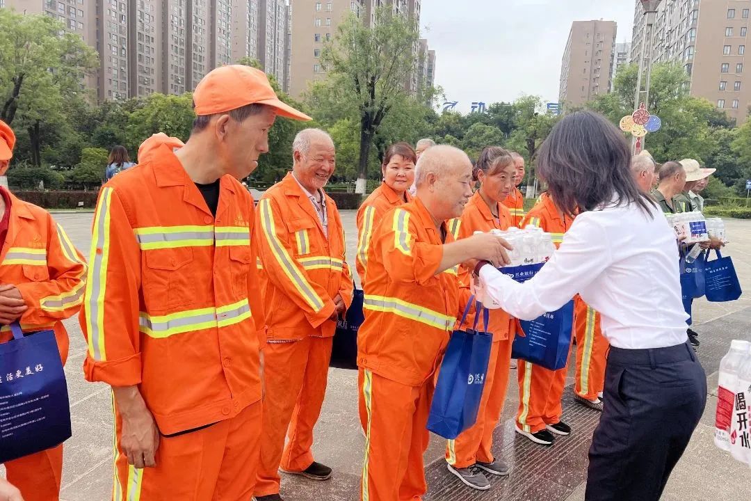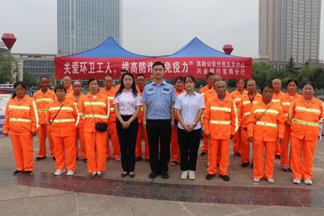 8月9日上午,兴业银行宝鸡分行开展“关爱环卫工人,提高防诈‘免疫力’”主题献爱心活动,向宝鸡高新园林环卫公司的一线环卫工作者捐赠瓶装水100件,并邀请宝鸡高新公安分局反诈中心的工作人员对参与活动的员工进行反诈教育宣传。