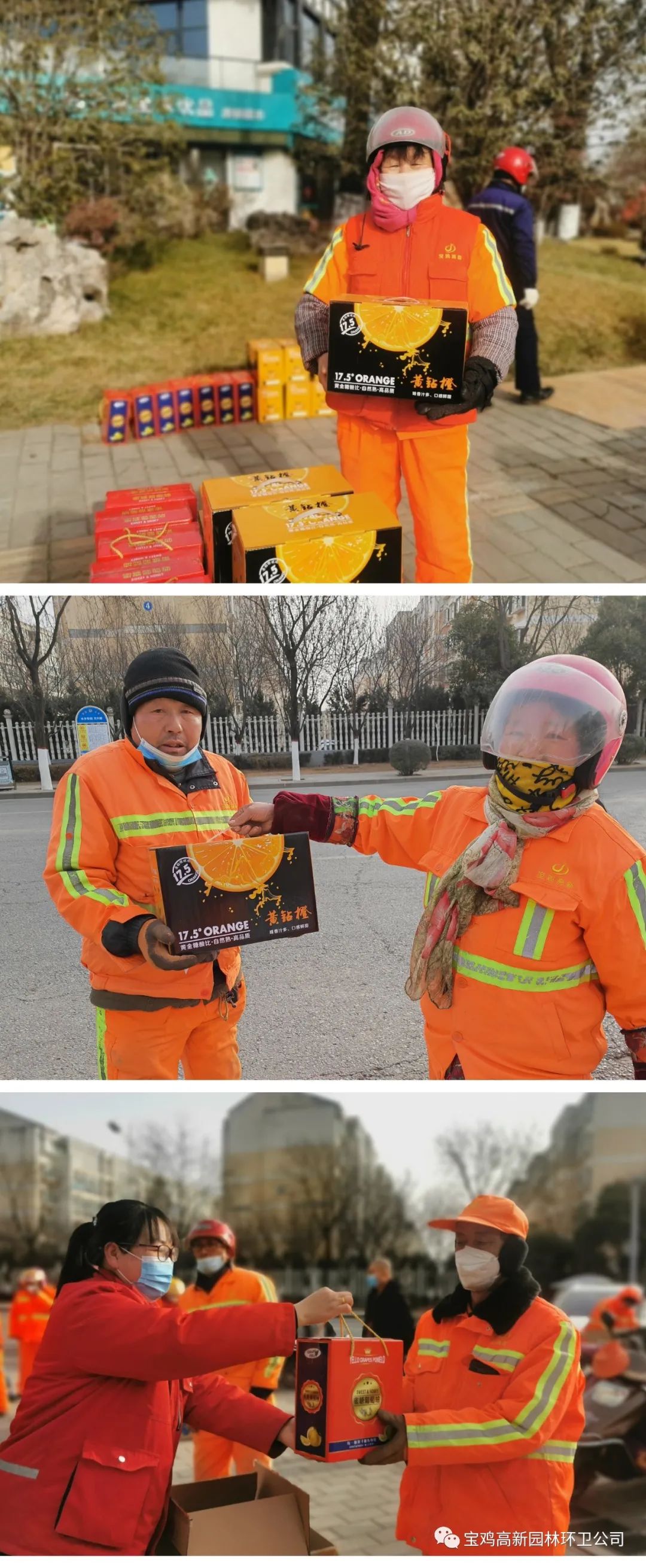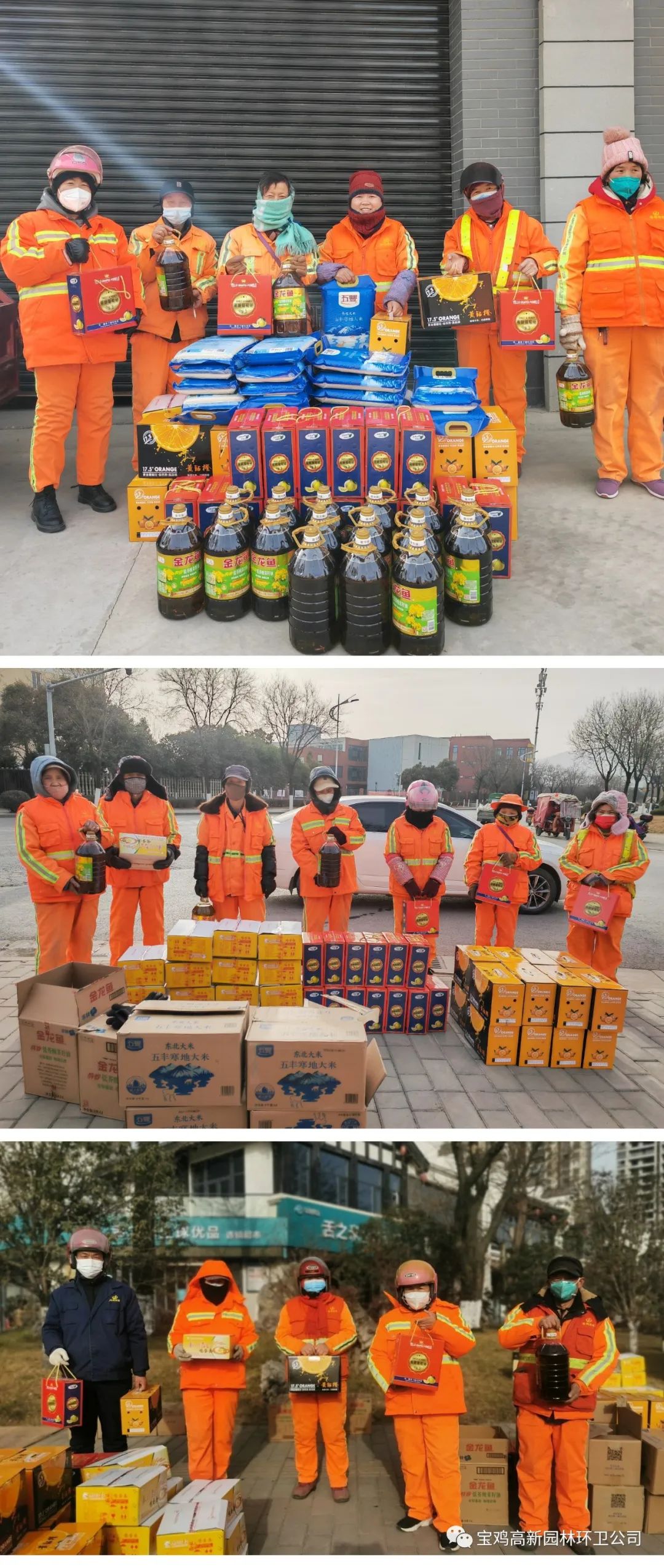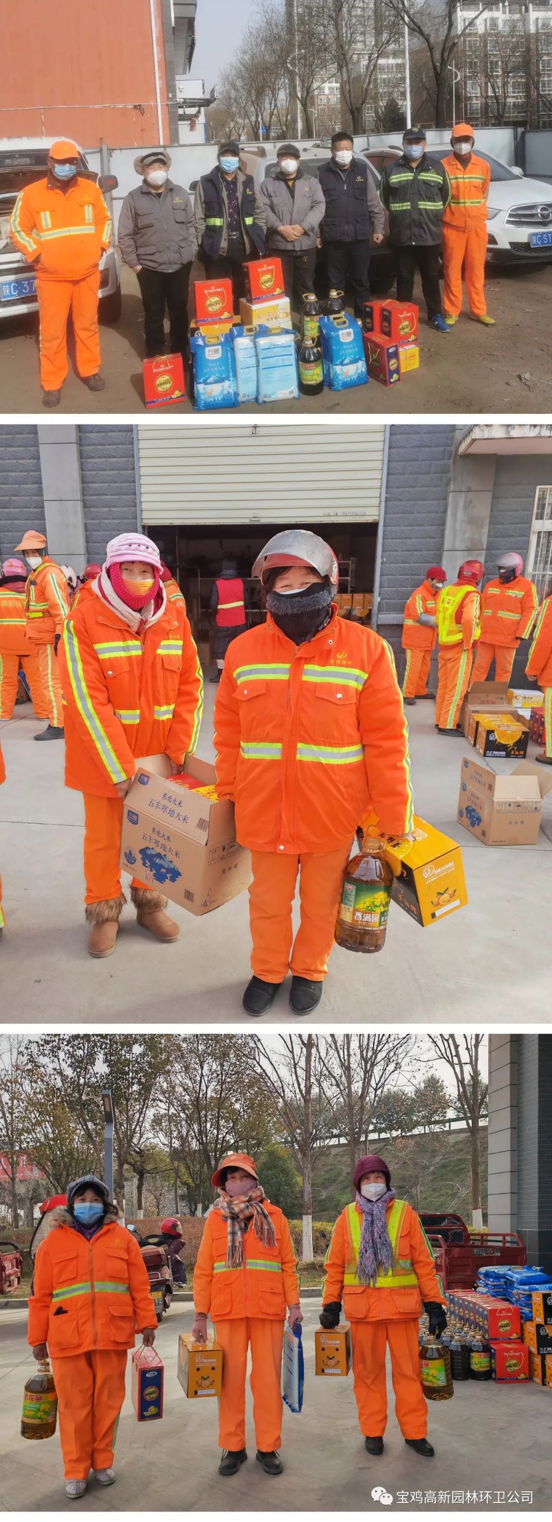 浓情佳节,关爱更浓。在春节临近之际,为表达对每一位环卫工人的关怀与祝福,感谢全体环卫工人为公司发展付出的辛勤努力,1月17日,高新园林环卫公司为园林环卫工人发放了春节福利。环卫工人们你帮我拎,我帮你抬,一箱箱年货在彼此手上传递,那种喜悦和满足浮现于每个人脸上,给这寒冷的冬天带来了阵阵暖意。慰问与关怀似一股暖流温暖着每一位环卫工人,他们的脸上也都洋溢着幸福的笑容。沉甸甸的福利不仅给大家带来了新春的祝福,也给每位员工心里带来了信心满满的希望和劲头!大家纷纷表示,在新的一年里精神饱满、干劲十足,更好地为公司的发展贡献力量。END长按扫码关注编辑:范康珍 审核 :张琼潇