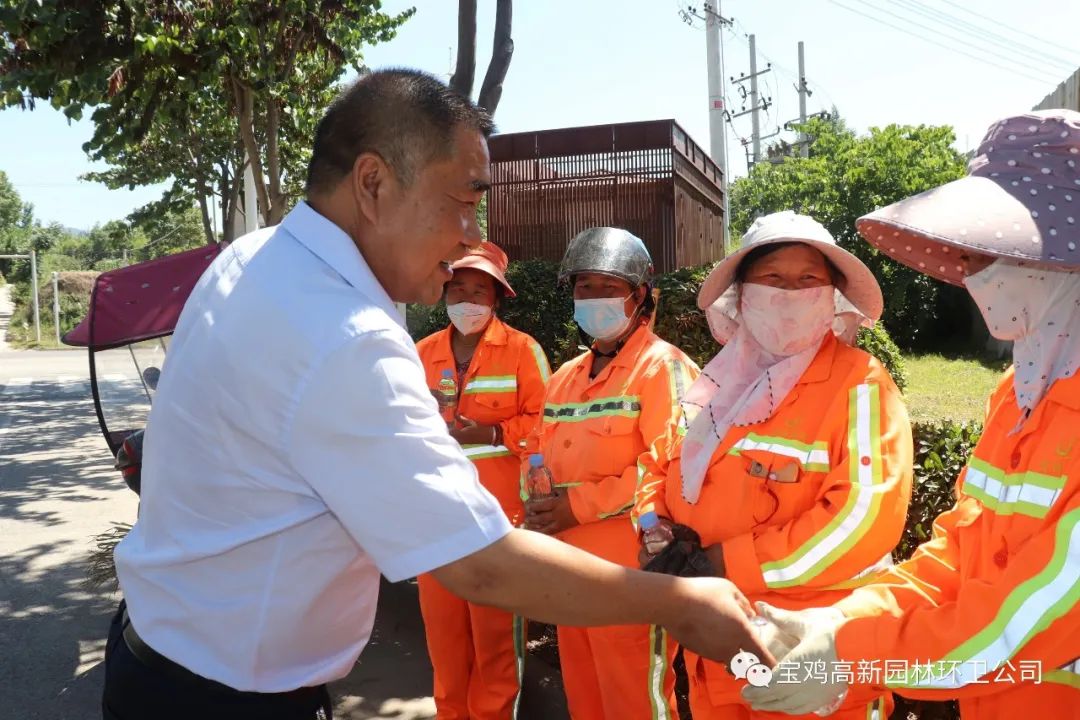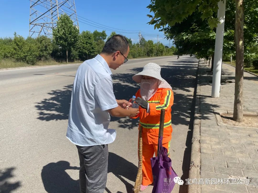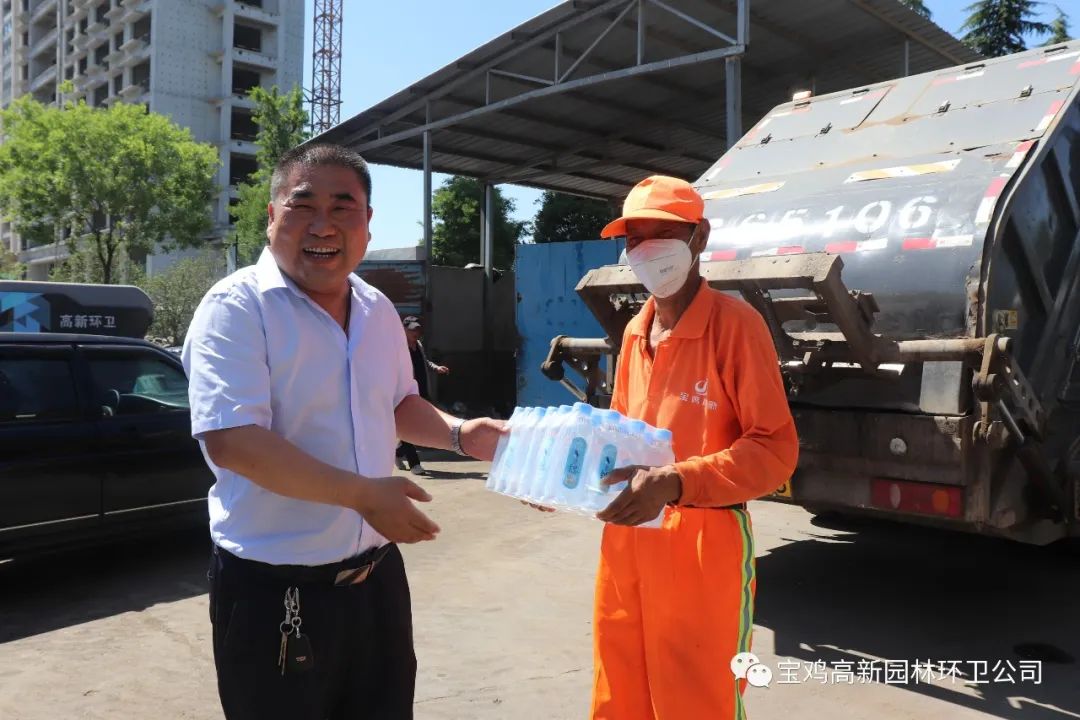 炎炎夏日,气温直线攀升,空旷的马路上一线环卫工人仍坚守在岗位上,接受着高温“烤”验。6月15日,公司副总经理范景林、总经理助理杨萍带领办公室工作人员到作业区域现场开展夏日“送清凉”活动,走访慰问一线员工,为他们送上矿泉水,在炎热的天气里把公司的关怀送到一线广大员工中去。