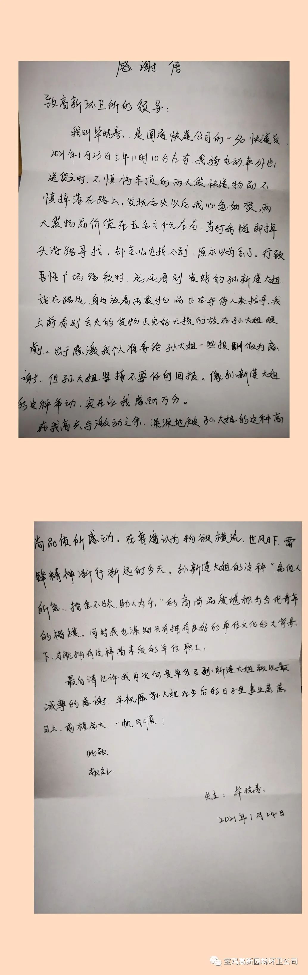 1月25日下午,一位年轻男子走进高新园林环卫公司,将一封感谢信送到工作人员的手中。