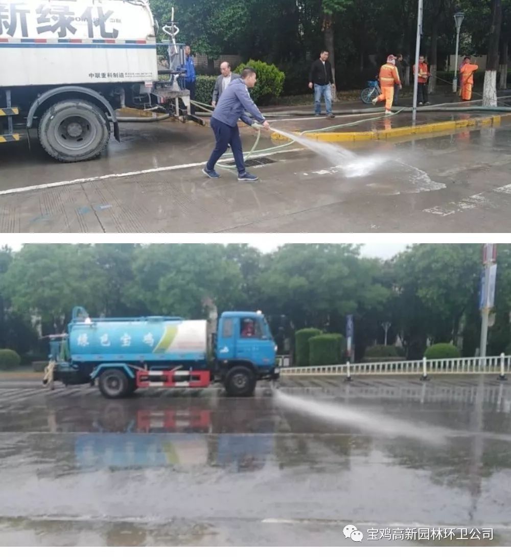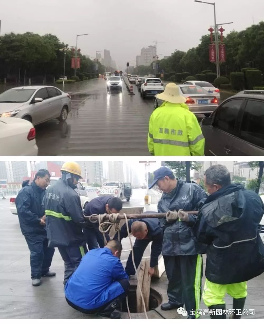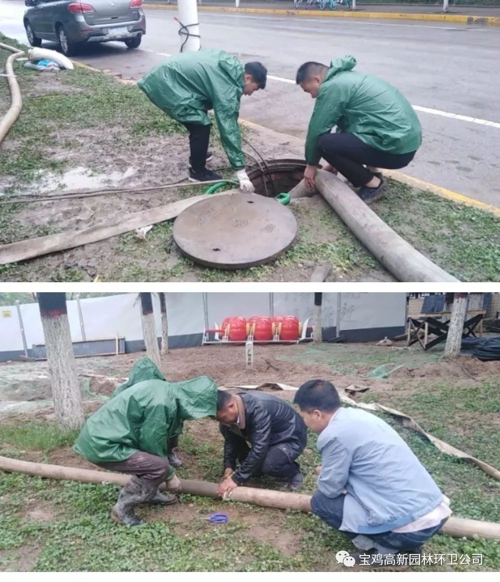 高新园林环卫立即启动应急预案,环卫、绿化、市政于凌晨5点半到达积水路面清理、排水,巡回考核检查组分段排查,车队冲洗及机扫车辆做好准备,全力做好雨中、雨后排水清淤工作。