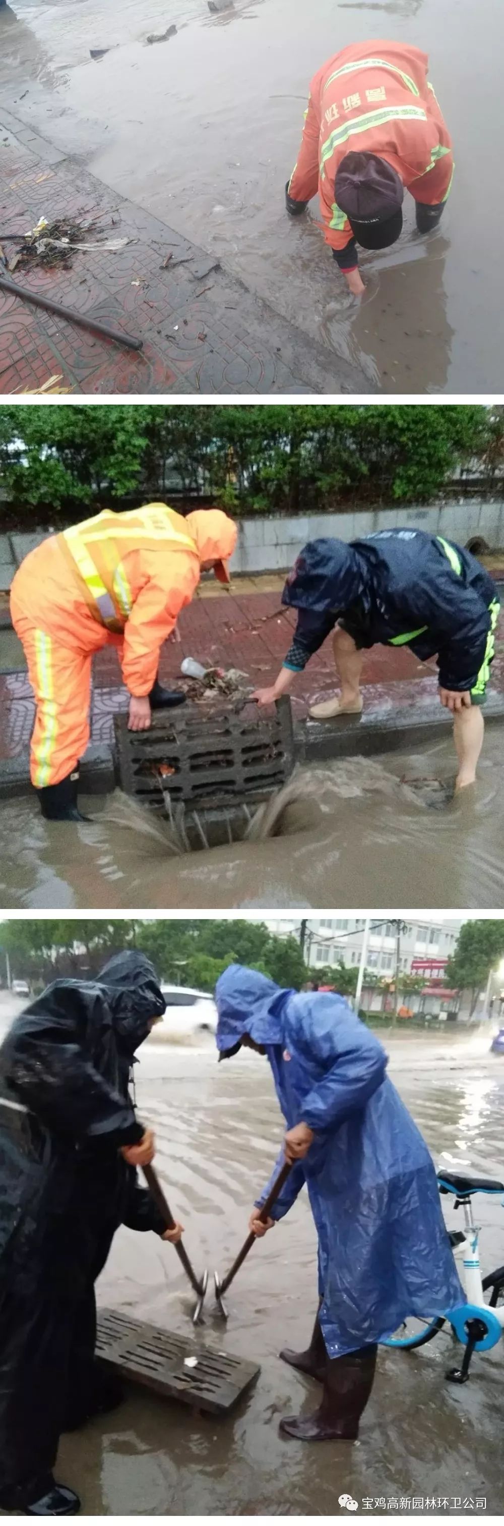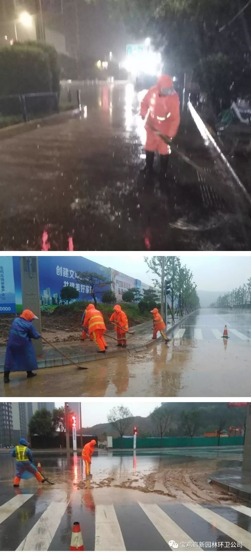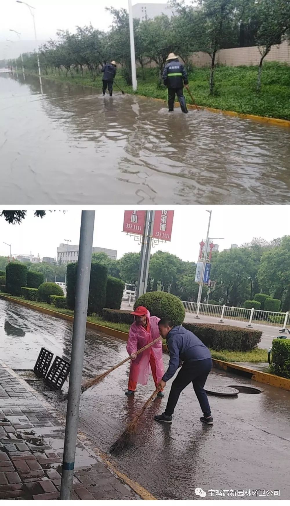 高新园林环卫立即启动应急预案,环卫、绿化、市政于凌晨5点半到达积水路面清理、排水,巡回考核检查组分段排查,车队冲洗及机扫车辆做好准备,全力做好雨中、雨后排水清淤工作。