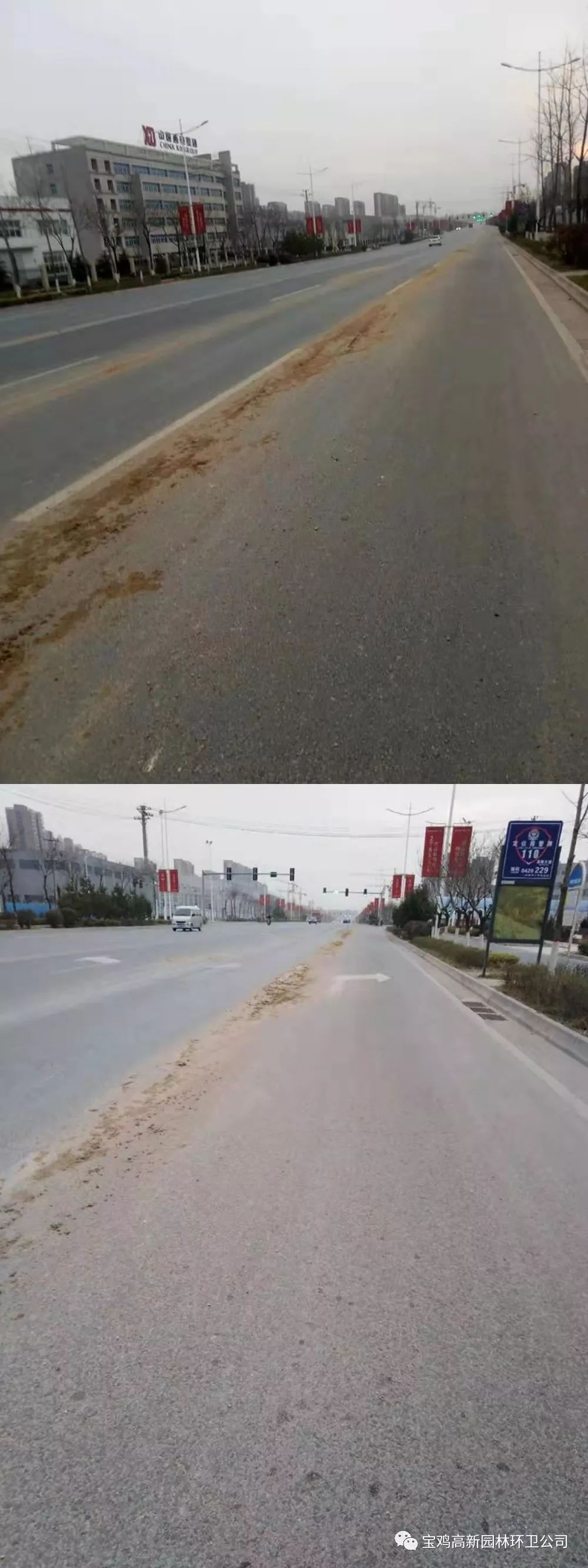 昨天,高新大道十四路至三十一路、滨河路14路至马尾河桥、中环路至滨河路、千河路口抛洒严重,影响车辆正常通行。高新园林环卫的环卫工人紧急清理,保障该路段恢复畅通。