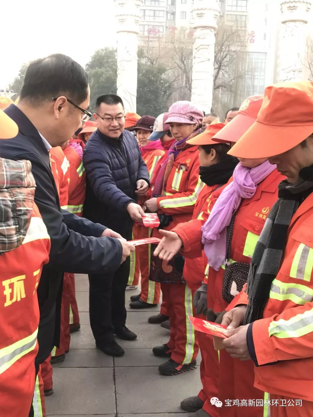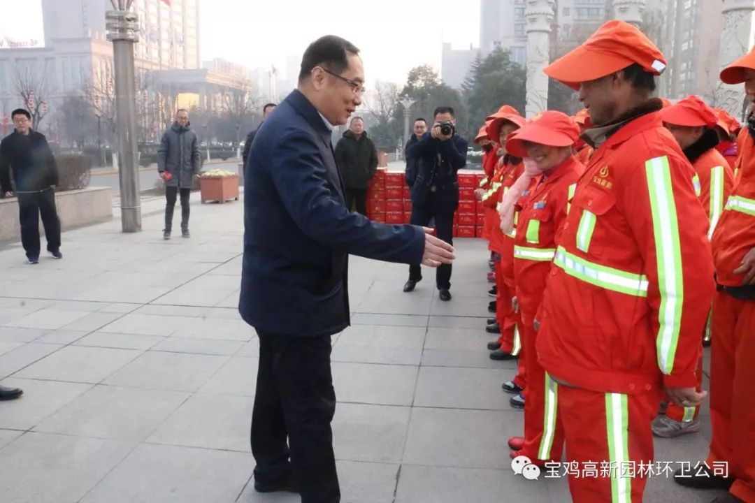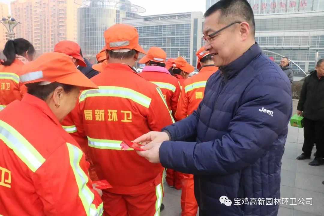 新春佳节,当我们享受与家人团聚的美好时光时,有这样一群人,他们依然坚守工作岗位,守护着城市的清洁,这就是我们可爱的“城市美容师”。像往常一样他们依旧穿梭在城市的大街小巷保洁作业,为使这些职工也度过一个温馨吉祥的新年,2月5日大年初一早晨,宝鸡高新区党工委书记、管委会主任郝晋升,管委会副主任、高新区公安局局长孟麦绪,高新区宣传部部长唐宏,总公司董事长冯延军,副总经理牛伟军等领导,对坚守在一线的环卫工人进行了慰问并带来了新春的祝福。