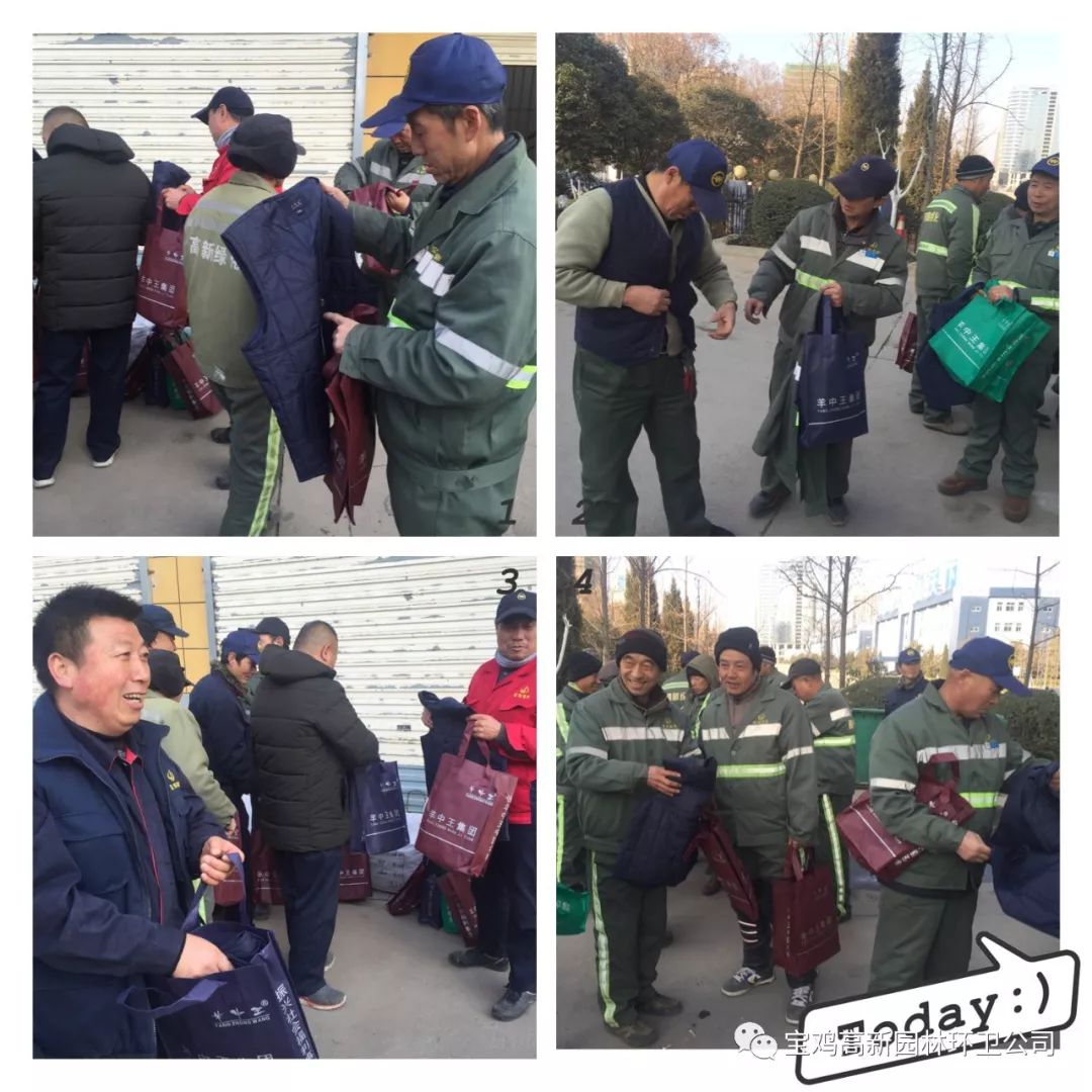 活动现场,市慈善总会捐赠了200件羊毛棉马夹,杨瑞乾会长代表宝鸡市慈善总会讲话,他对高新区园林环卫工作给予了高度评价,称赞她(他)们为城市的环境卫生和文明进步,付出的艰辛和努力表示高度赞赏,最后他还为广大园林环卫工人送上了新年的祝福。